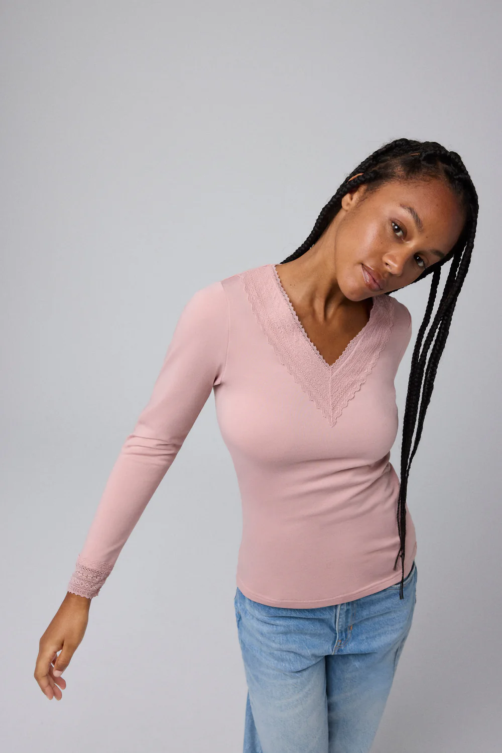 A cada temporada nos concentramos em criar roupas que façam você se sentir bem consigo mesmo em todos os momentos. E com a camisola térmica com decote em V verá o resultado: embeleza e realça a sua figura, acrescentando um toque moderno aos seus looks do dia a dia. Os detalhes em renda no decote e punhos proporcionam sofisticação e delicadeza, permitindo conforto e elegância em qualquer ocasião.
