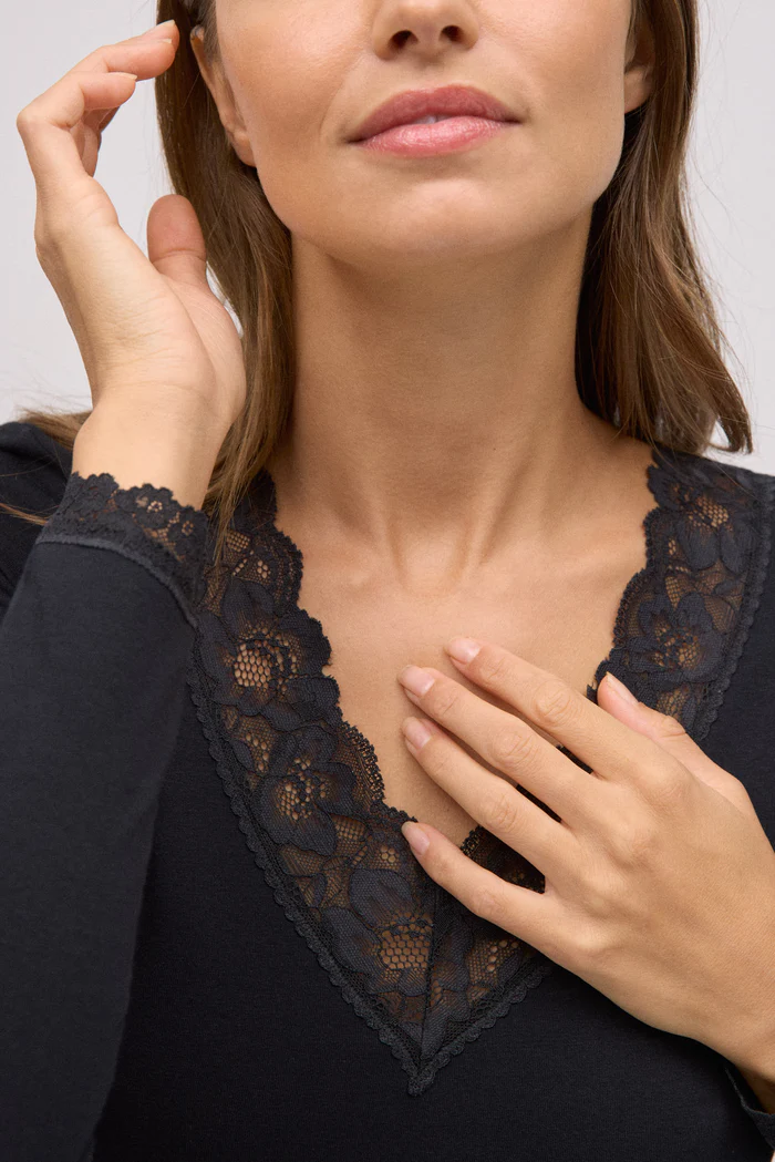 Camiseta de manga comprida em algodão natural com design confortável e macio ao toque. O decote em V é adornado com renda floral combinando, proporcionando um acabamento elegante e feminino. Ideal como roupa íntima ou para looks descontraídos e estilosos.